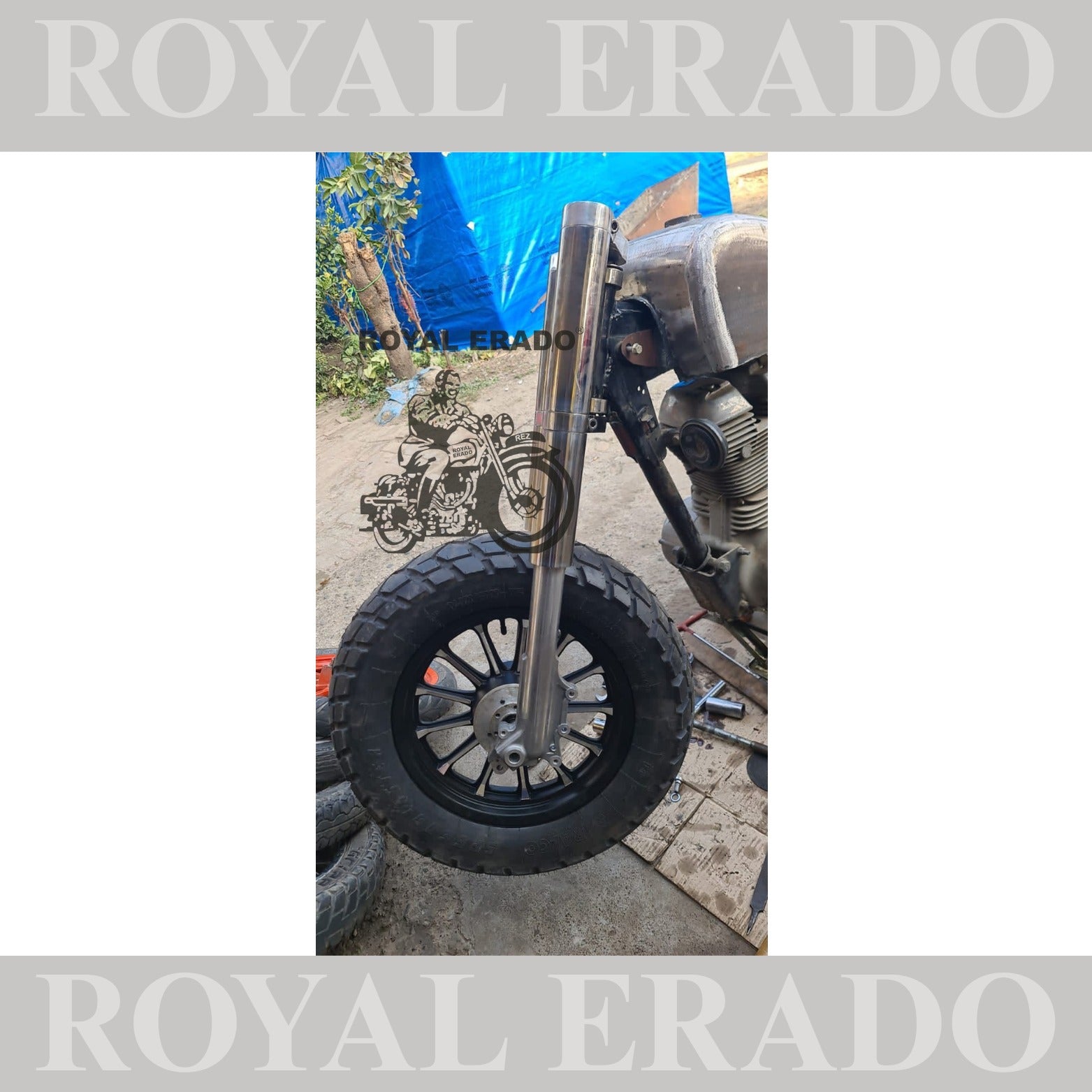 Front broad fork with alloy and tire for 150 number tire at front fit to royal Enfield Classic Electra or Standard to make bobber Harley 883 and Harley 48 style