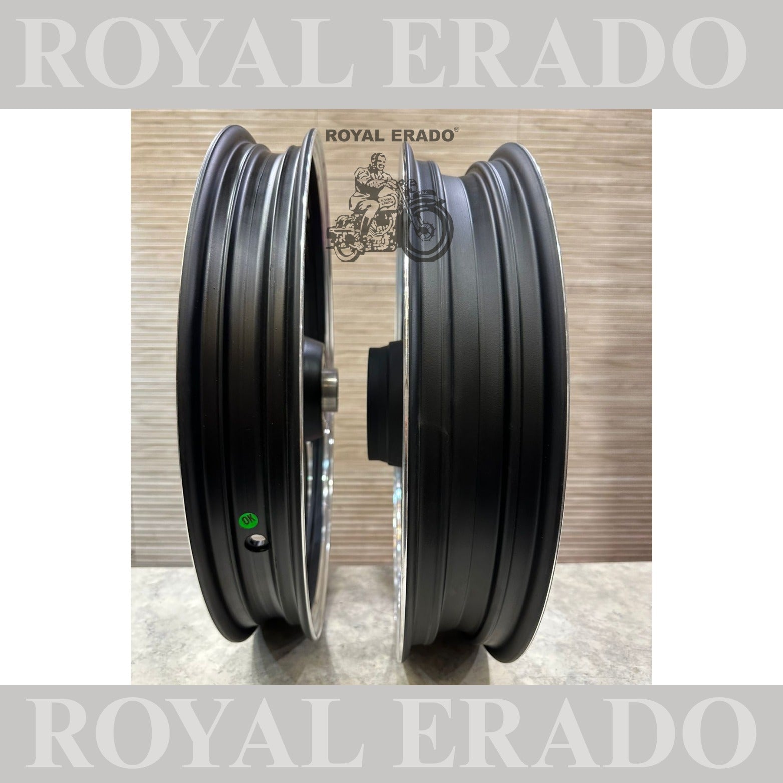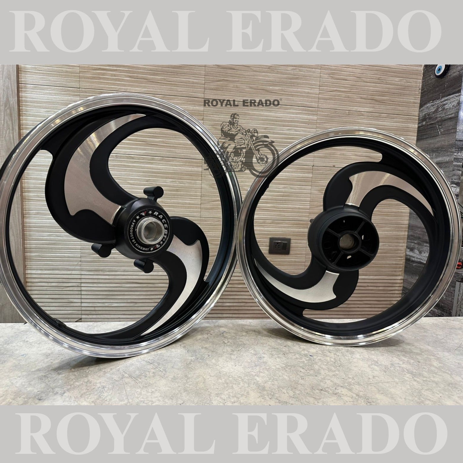 Raceby / kingway 2 spoke 2 s Talwar alloy wheel in black Royal Enfield Reborn Classic and Standard battalion double disc alloy wheel