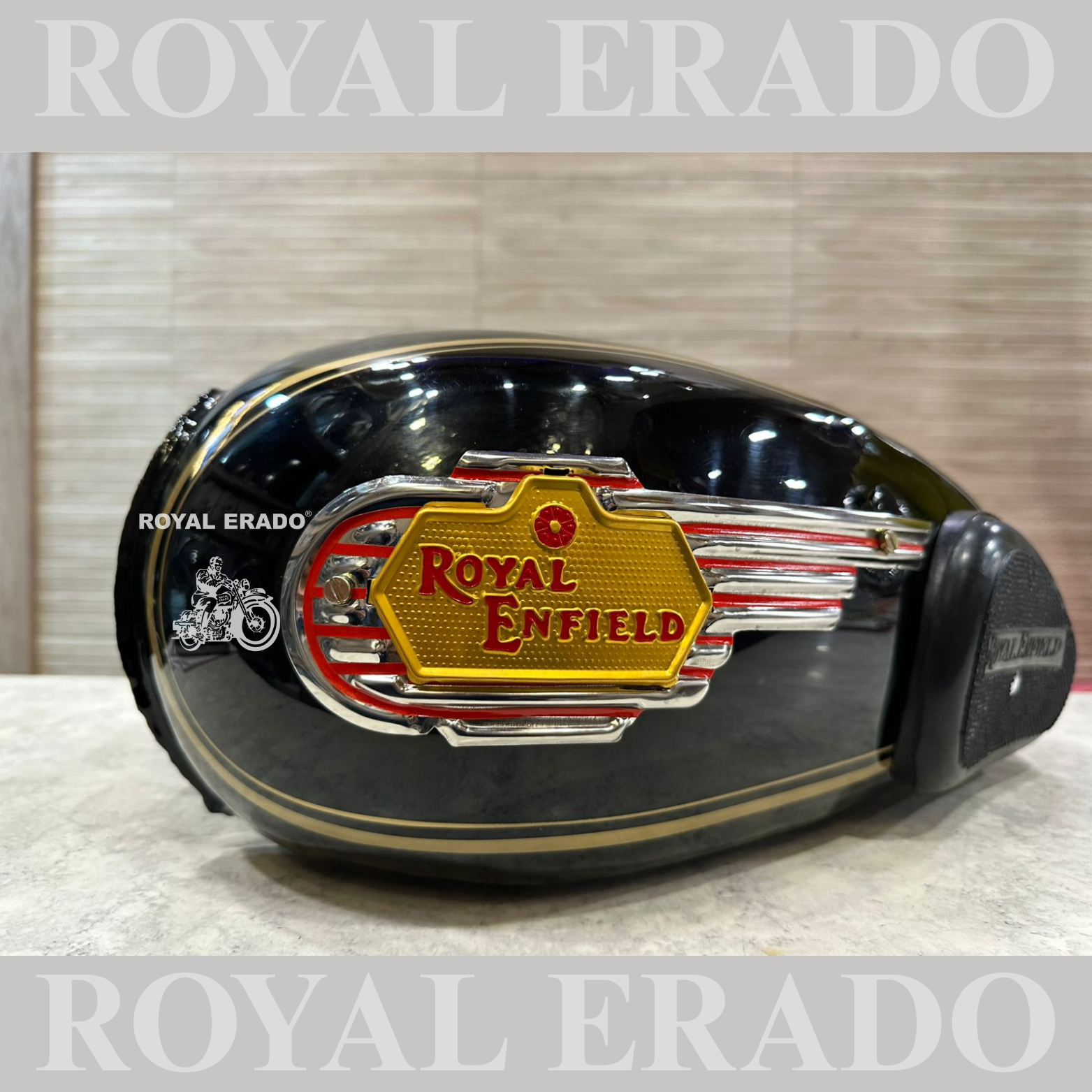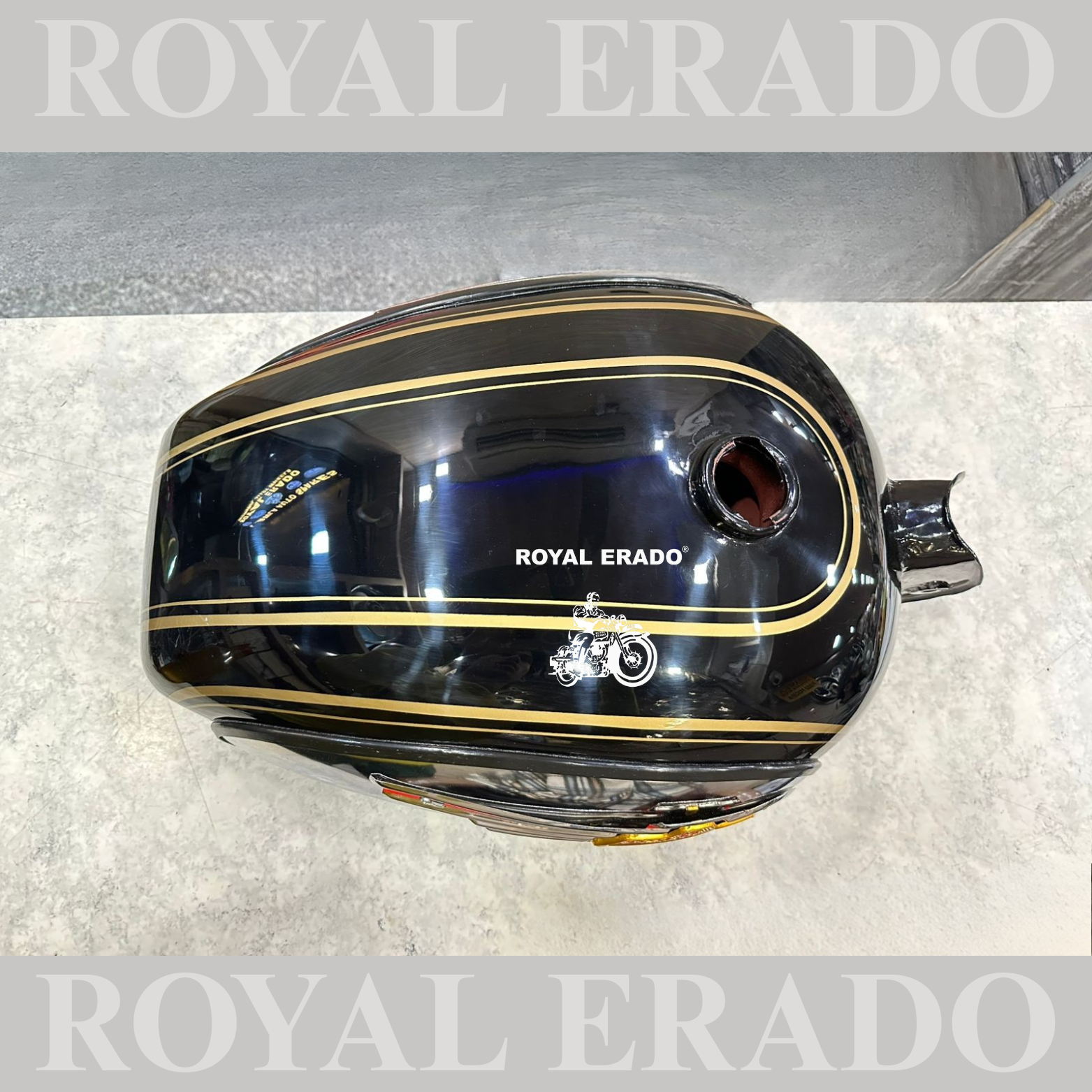 Royal Enfield bullet Classic Electra and Standard tank with Monogram and knee pad in black with golden lining in paint.